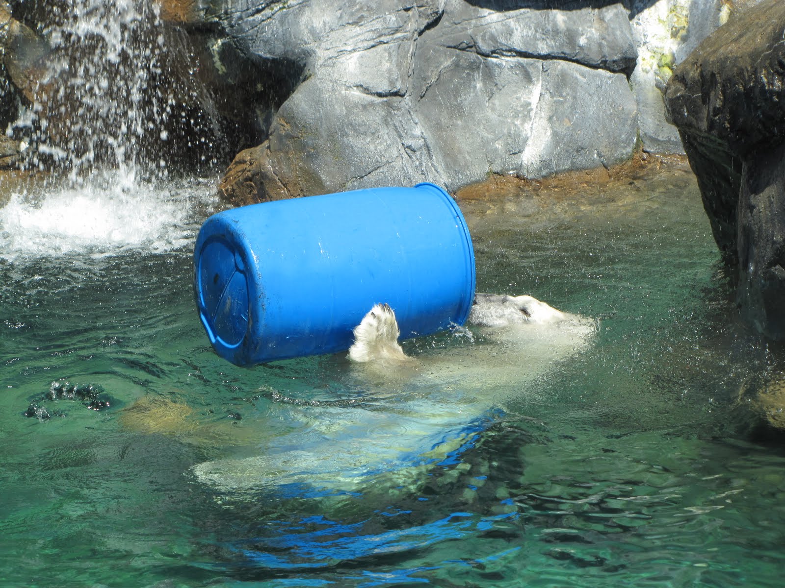 Zero had great fun with the floating ice, and his barrel, sometimes balancing the barrel, and other times hugging it as he floated along. A zoo employee told me that they do have plenty of toys. Zero is very playful and has a big personality.
