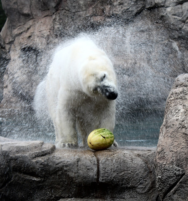 Qannik was in Polar Bear Alley, cooling off in a spot in the center where a strategically placed fan blew a refreshing mist down from the ceiling, She loved it. There was also big tub of ice for her playtime enjoyment.